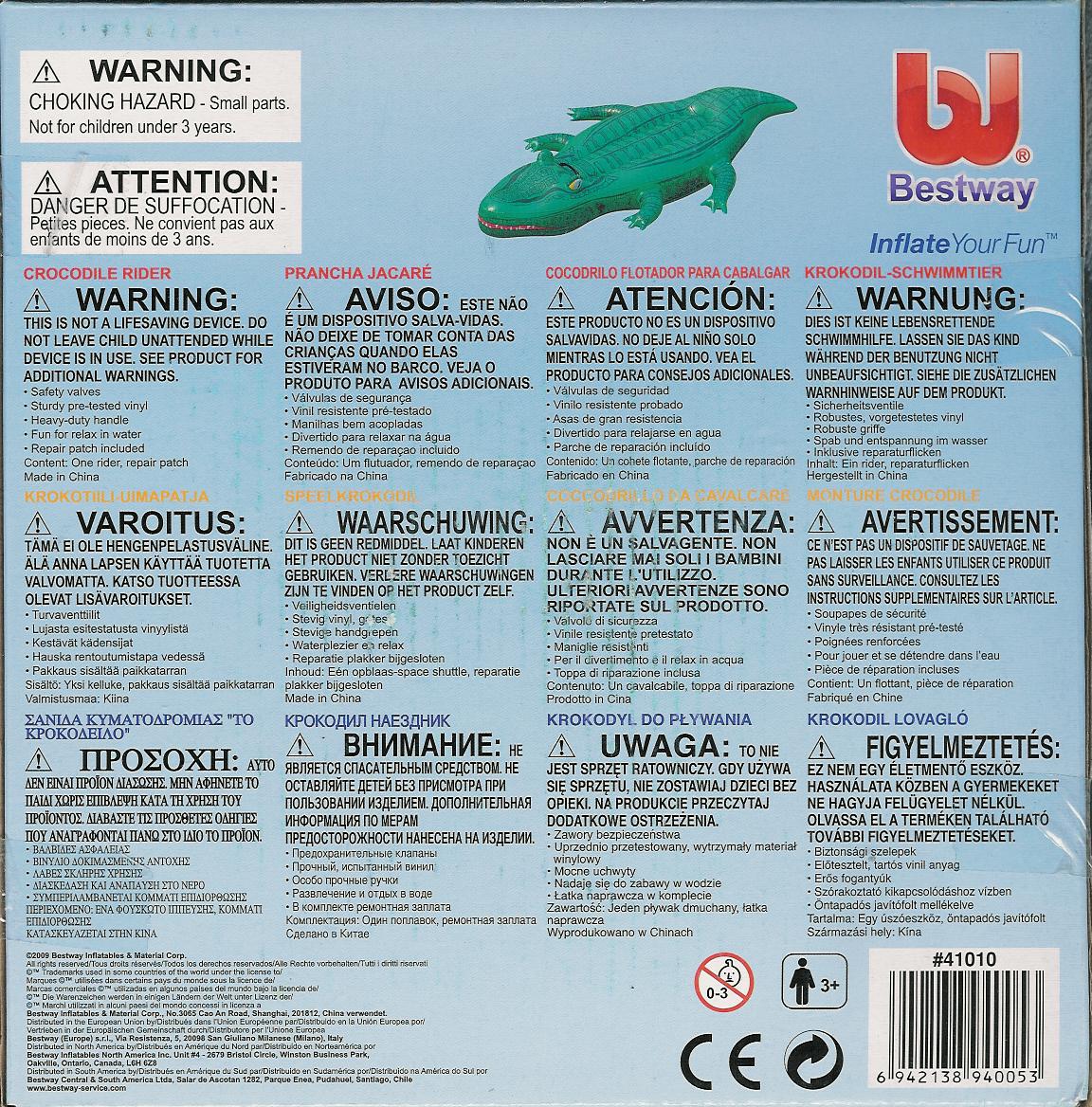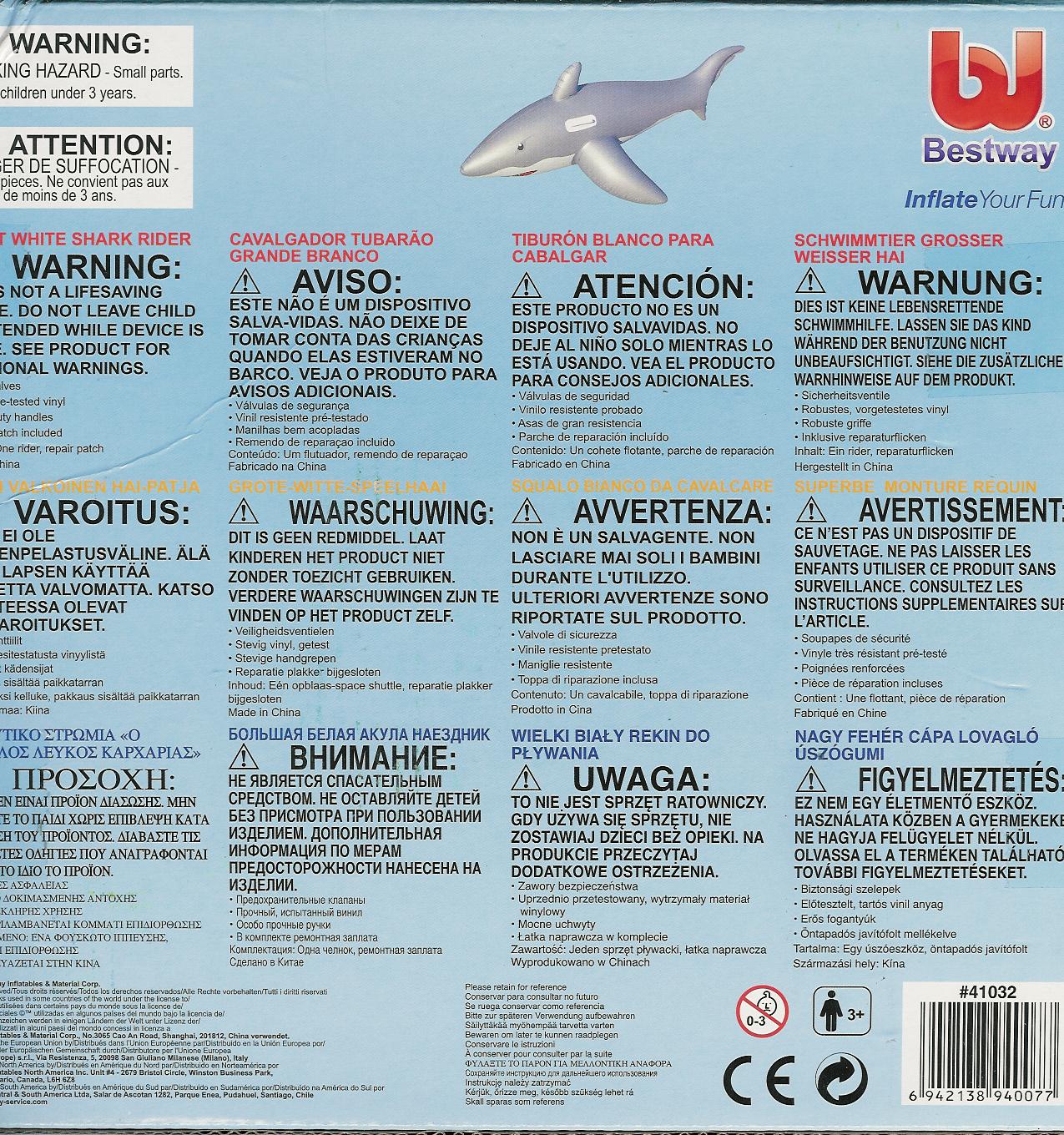 Descripción del producto Botes inflables o flotadores, con forma de cocodrilo ó de tiburón, de colores verde y gris respectivamente, marca "Bestway". Para cabalgar en el agua de piscina, incluye válvulas de seguridad, fabricado de vinilo resistente y probado, con asas de gran resistencia, divertido para relajarse y entretenerse en el agua. Además incluye un parche de reparación ante eventual pinchazo. No recomendable para uso en el mar, solo piscinas y, en el caso de niños, utilizarlo solamente en la parte poco profunda de la piscina a menos de que esté acompañado de un adulto. En el mar solo para personas que sepan nadar muy bien, previniendo un pinchazo que pueda desinflar el bote.