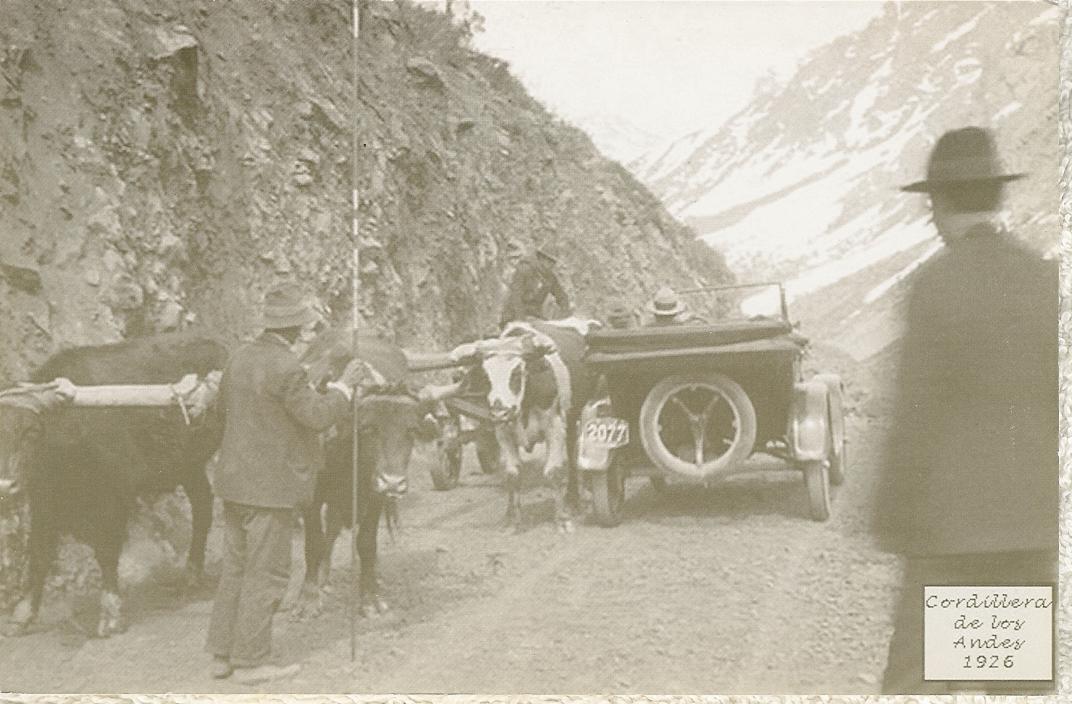 CORDILLERA DE LOS ANDES CON CARRETA Y AUTOMÓVIL ANTIGUO PLACA Nº 2077
