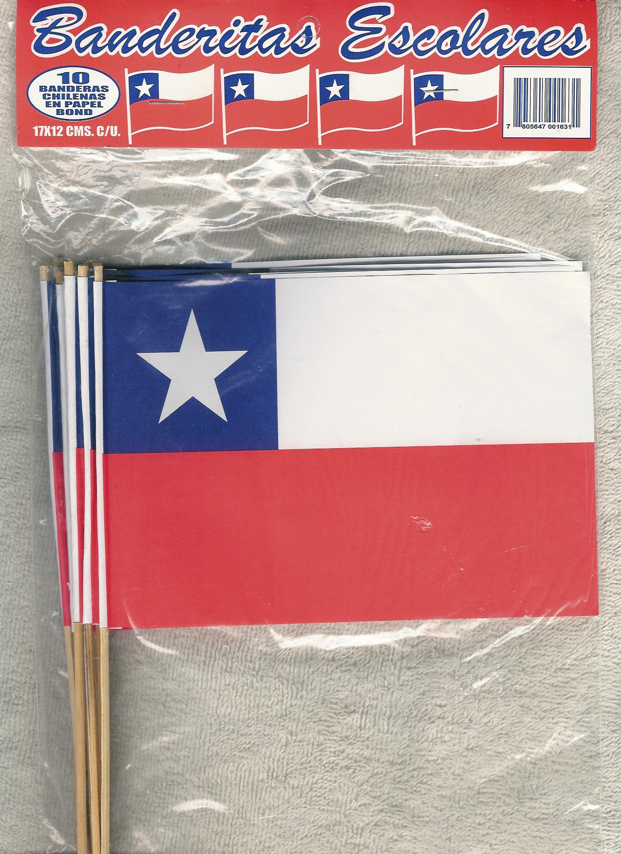 | BANDERITAS CHILENAS DE PAPEL 17 CM. X 11 CM. ESCOLAR EN BOLSA DE 10 UNIDADES