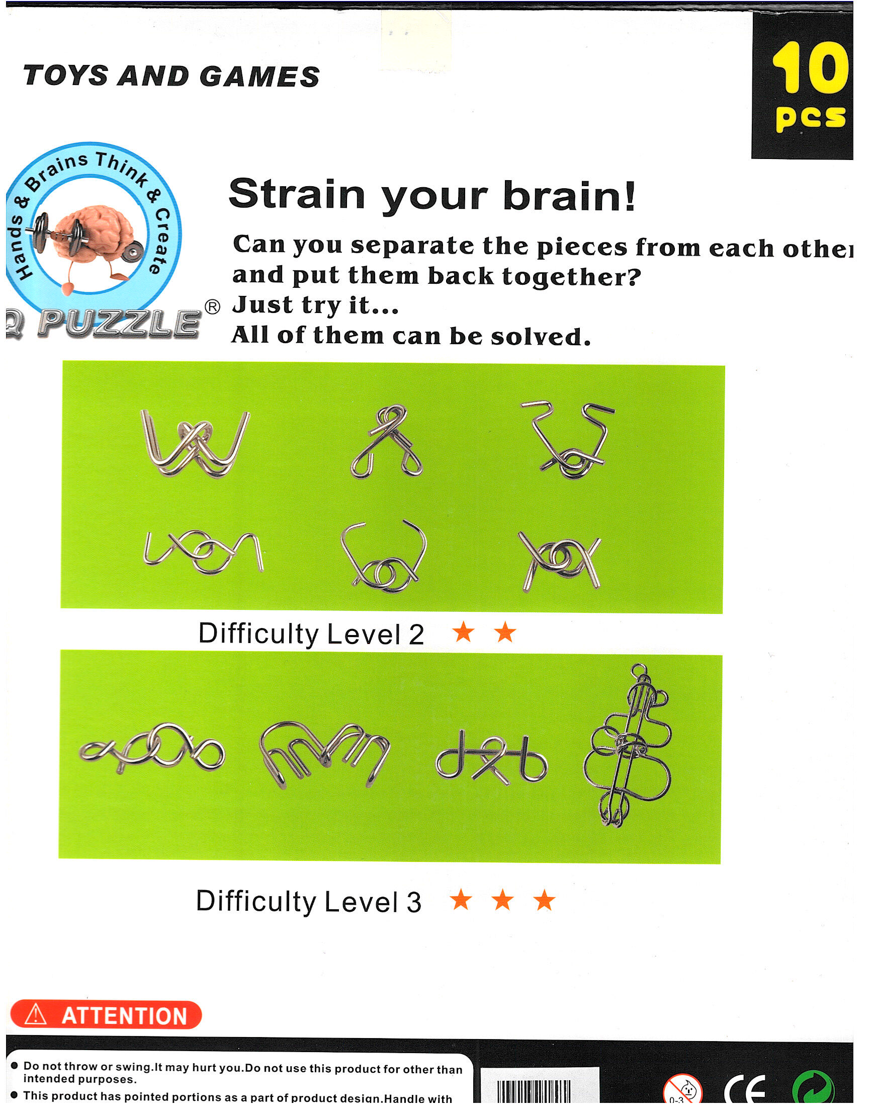 PUZZLE IQ, juego para desafiar la habilidad mental y paciencia de personas de diversas edades, pero de especial entretención y ayuda a los adultos mayores, permitiéndoles desarrollar sanamente su actividad cerebral. Se trata de piezas metálicas de diversos tamaños, unidas entre sí a manera de una cadena, pero con la característica de que pueden ser removidas de su lugar y con la posibilidad inversa de ser reinstaladas como estaban antes. En otras palabras, se trata de un desafío consistente en un pequeño rompecabezas tridimensional que ejercita la mente y entretiene a la vez. El lema aquí es: "Estruja tu cerebro".