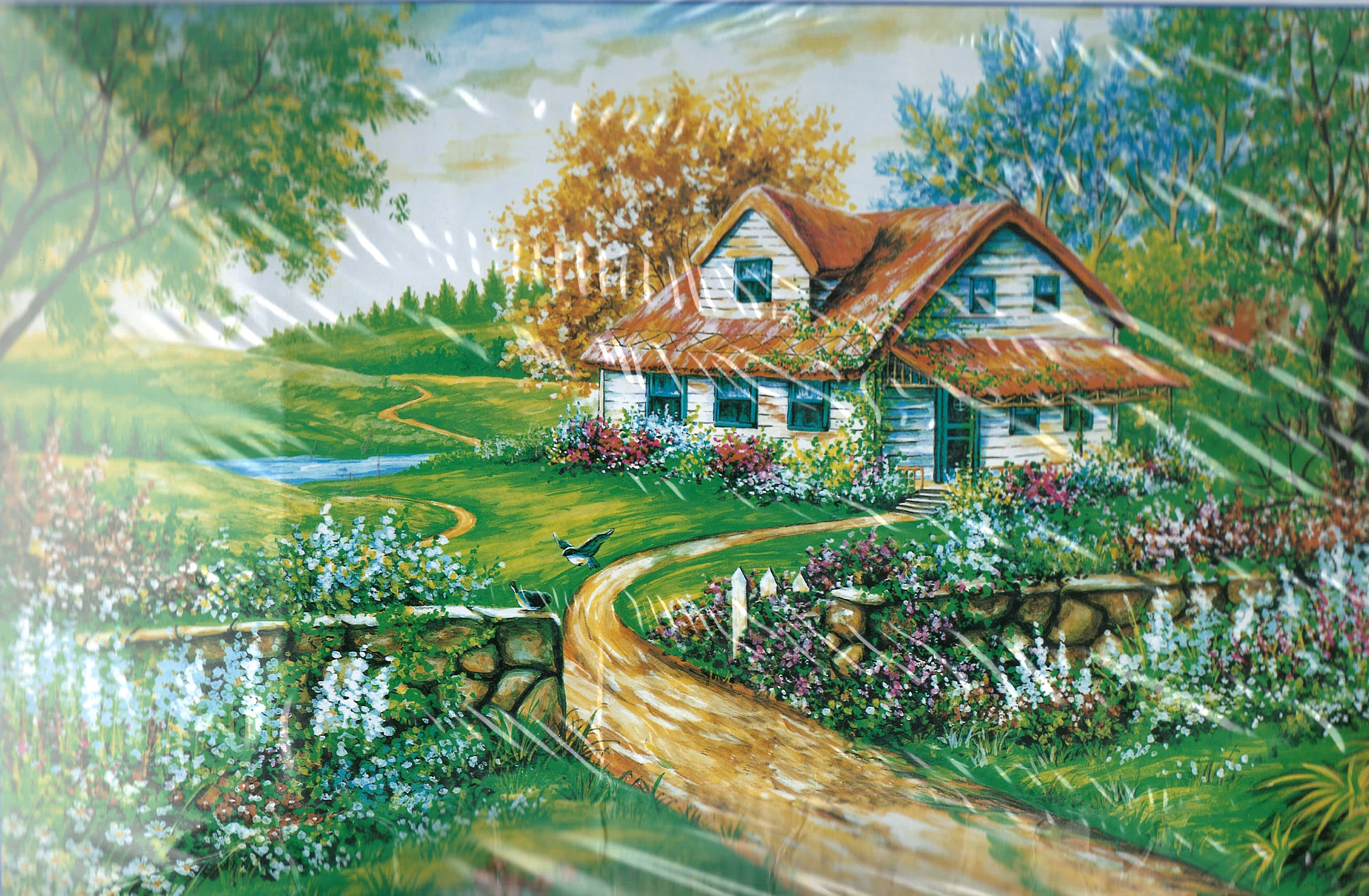 ESCENA CASITA EN EL CAMPO, FLORES, ÁRBOLES, PLANTAS, PAISAJE, 1000