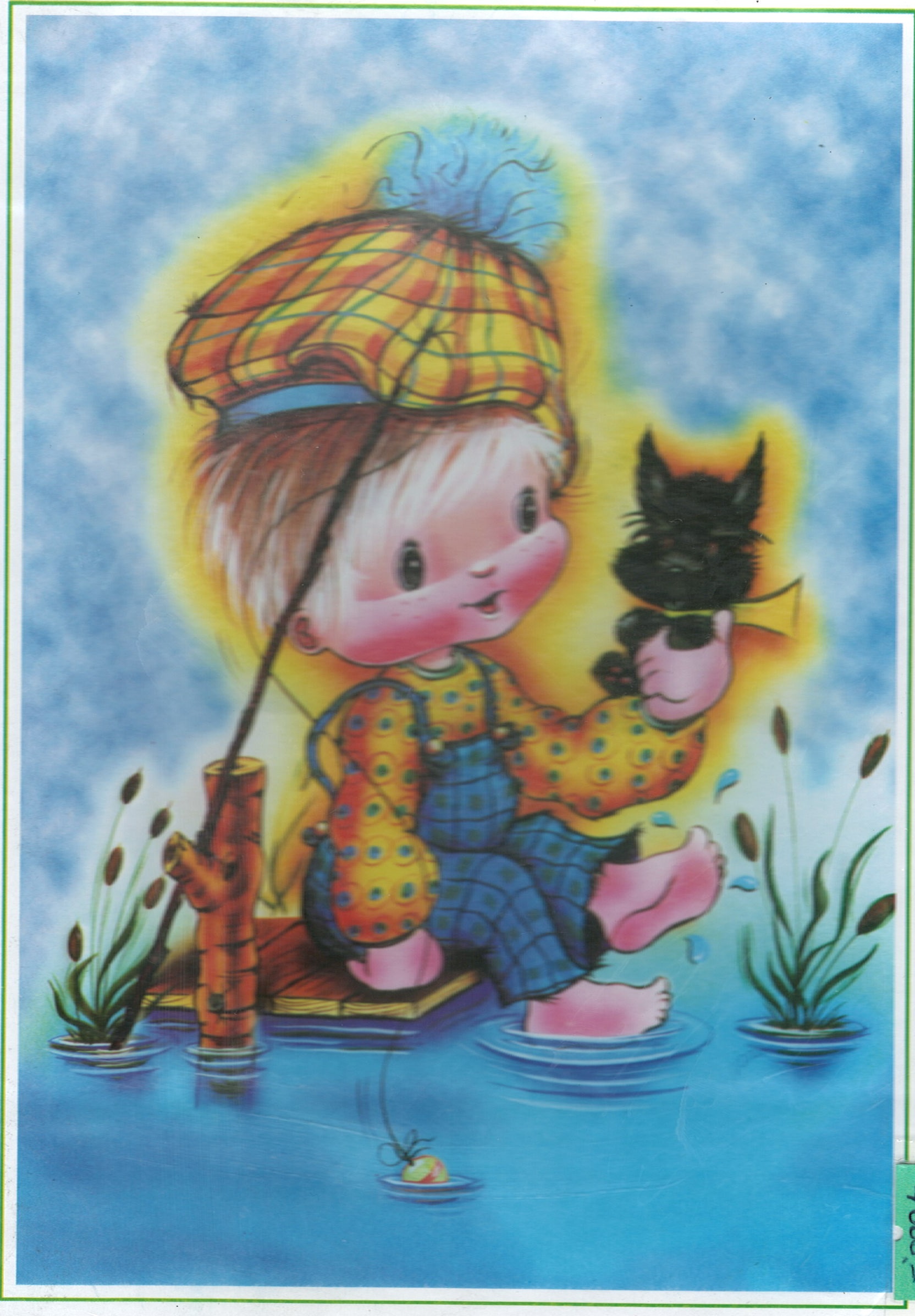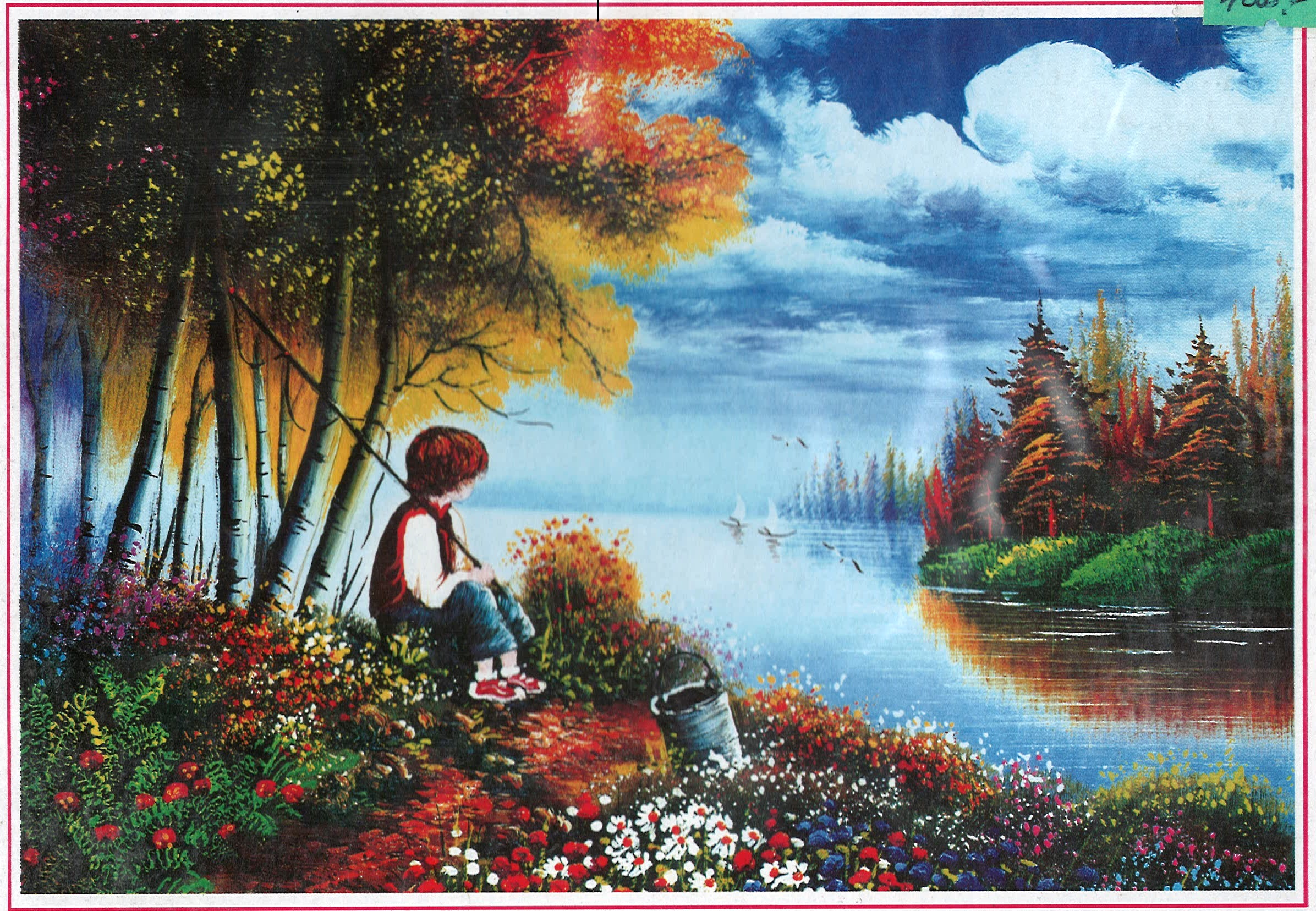 ESCENA DE NIÑO CON CAÑA DE PESCAR MIRANDO AVECITAS VOLANDO EN MEDIO