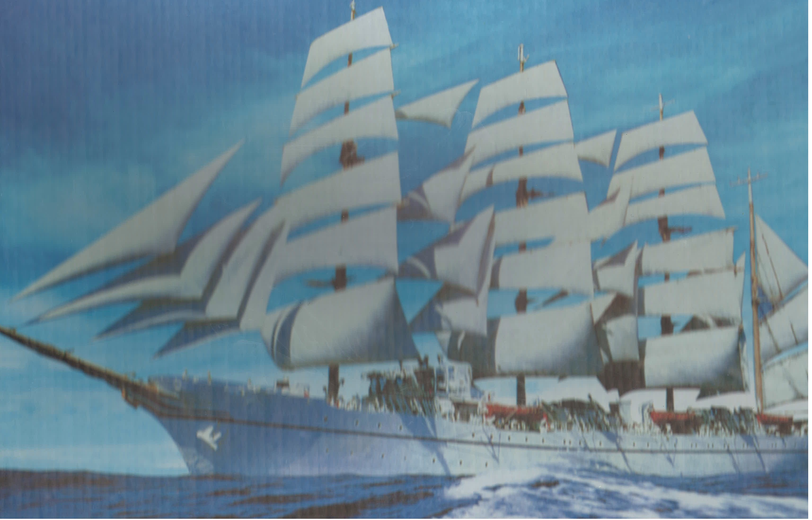 DE BARCO CON 4 MÁSTILES CON VELAS DESPLEGADAS EN MEDIO DE MAR Y CIELO AZULES