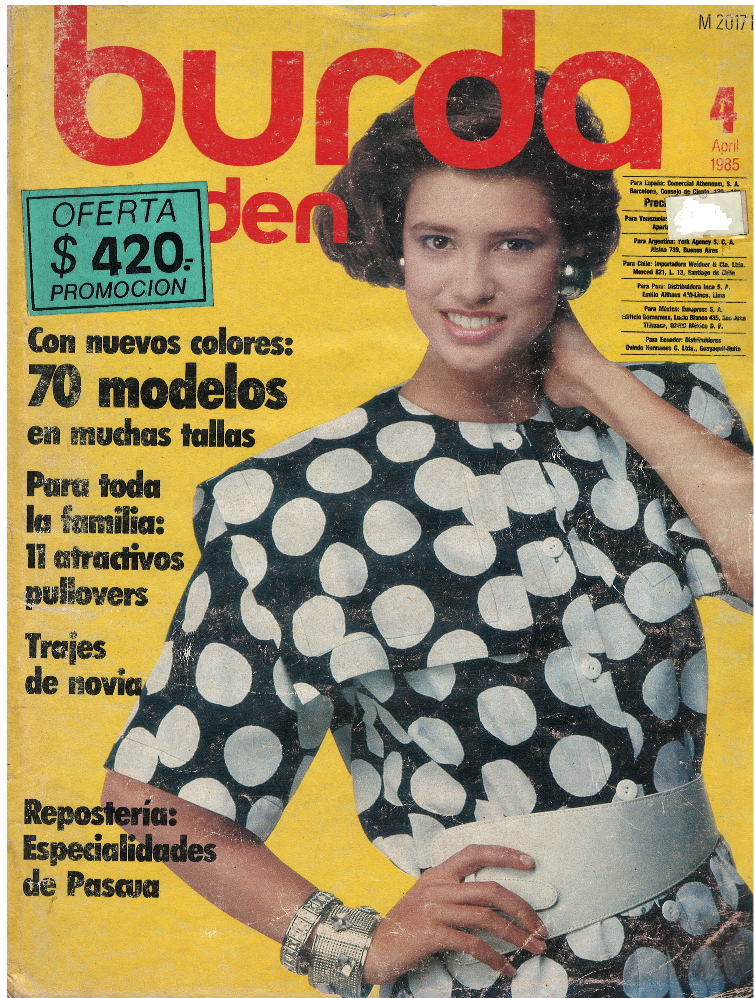 REVISTA "BURDA MODEN", N° 4, APRIL 1985 / CON NUEVOS COLORES: 70 MODELOS EN MUCHAS TALLAS / PARA TODA LA FAMILIA: 11 ATRACTIVOS PULLOVERS / TRAJES DE NOVIA / REPOSTERÍA: ESPECIALIDADES DE PASCUA / IMPRESA EN ALEMÁN PERO CON TEXTO SUPLEMENTO EN ESPAÑOL. $ 5.000
