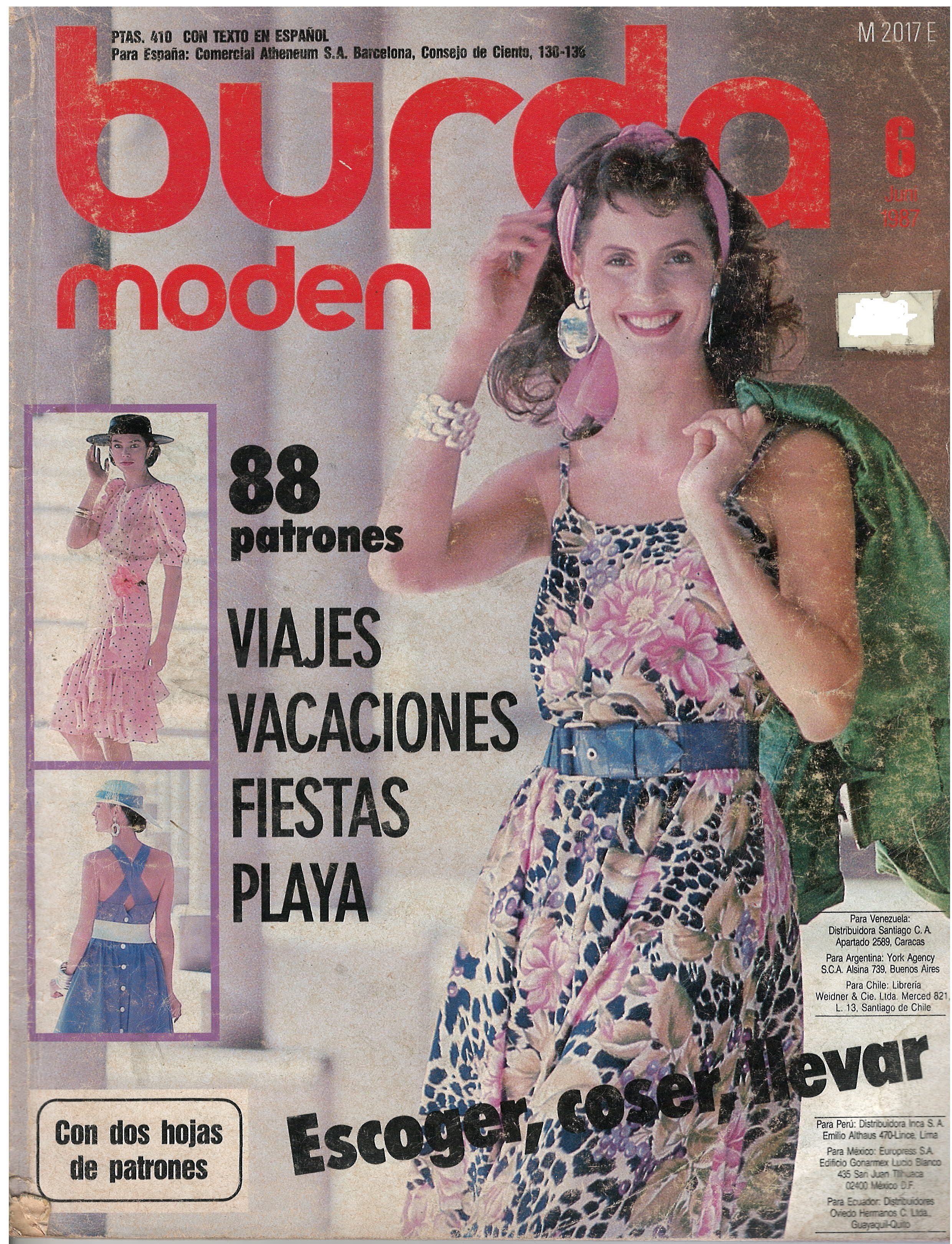 REVISTA "BURDA MODEN", N° 6, JUNI 1987 / 88 PATRONES / VIAJES / VACACIONES / FIESTAS / PLAYA/ ESCOGER, COSER / LLEVAR / CON DOS HOJAS DE PATRONES /  IMPRESA EN ALEMÁN PERO CON TEXTO SUPLEMENTO EN ESPAÑOL. $ 5.000